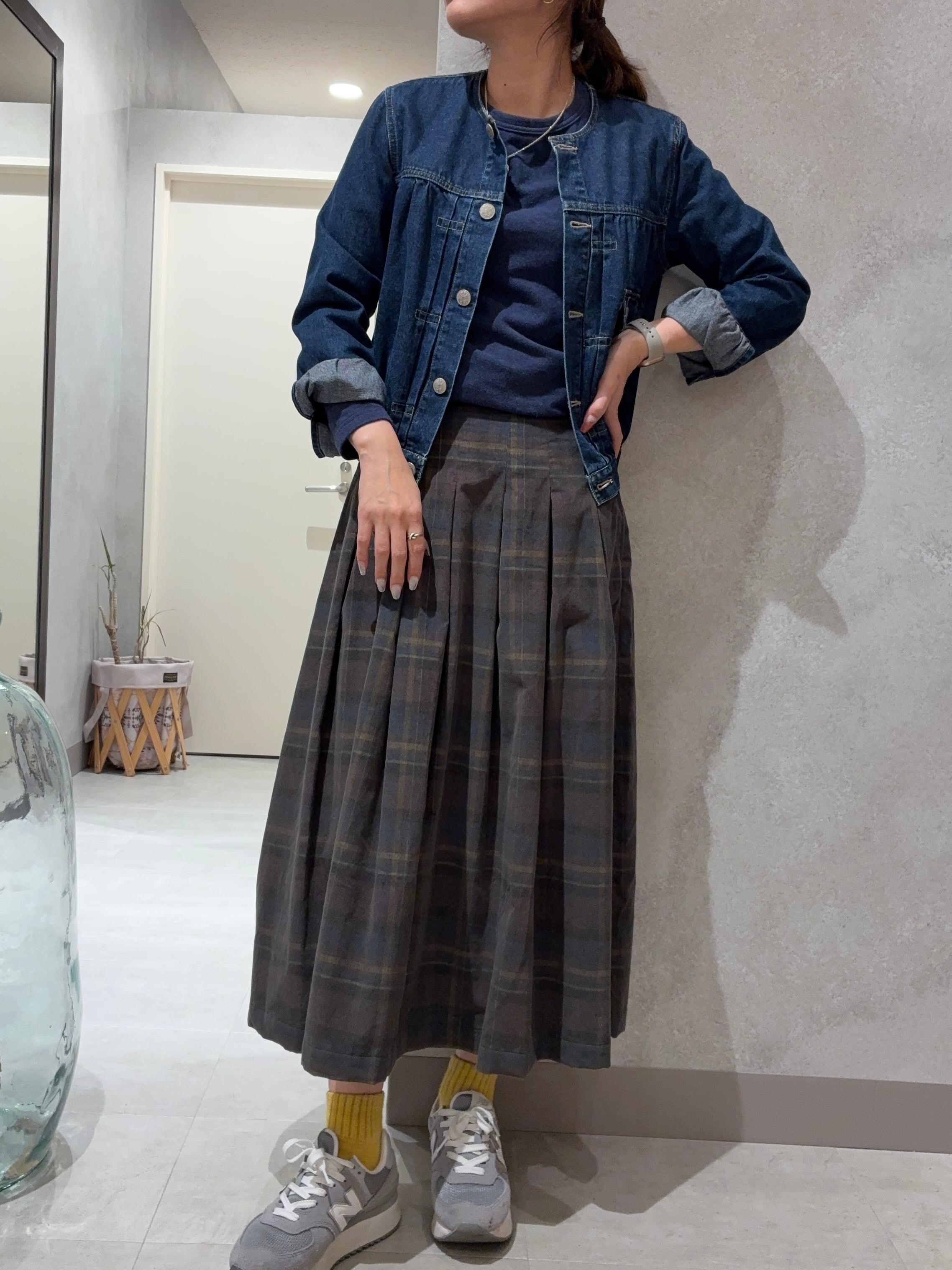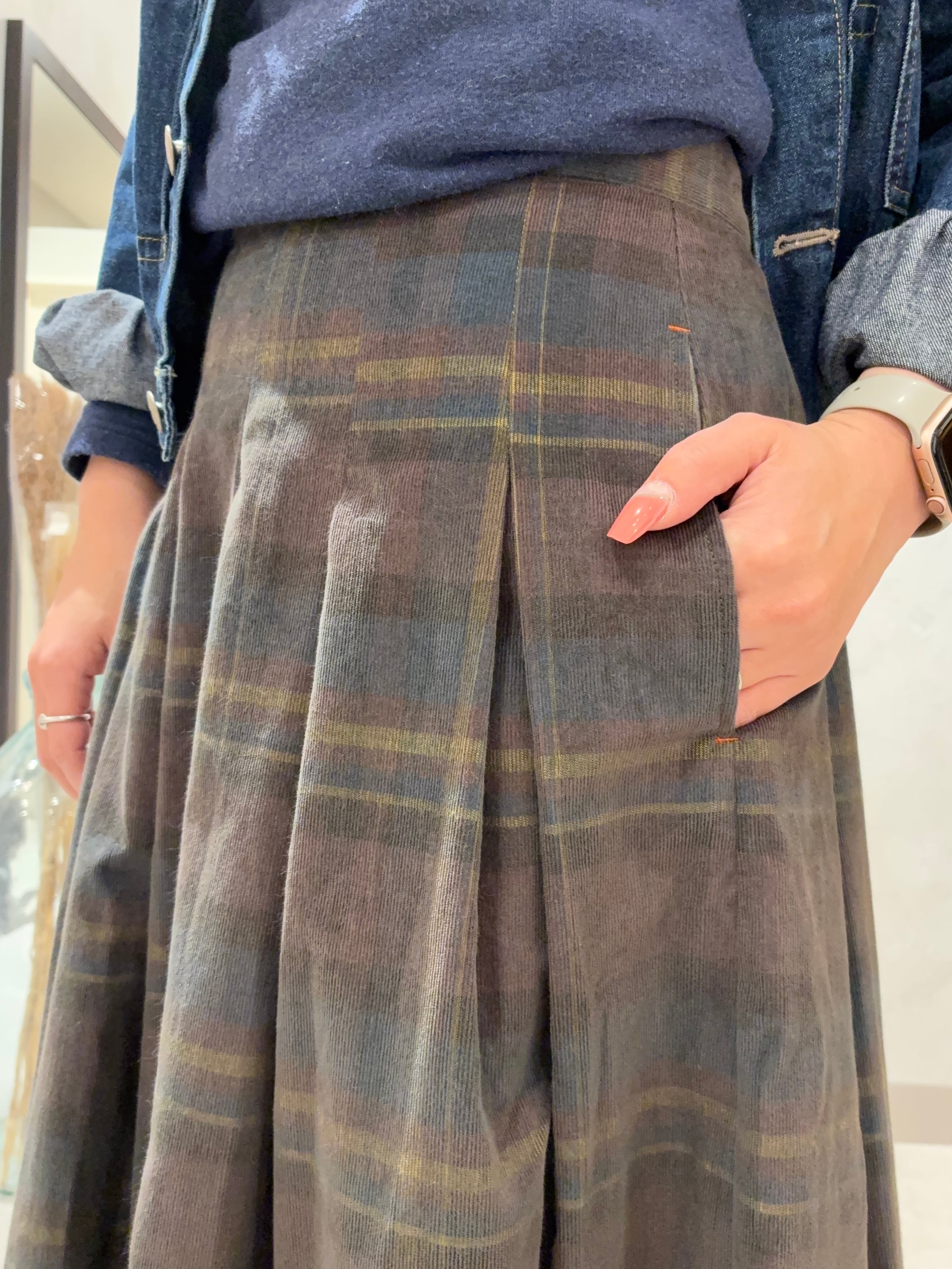 さりげないチェック柄とコーデュロイの組み合わせが季節感をコーディネートに取り入れてくれます。