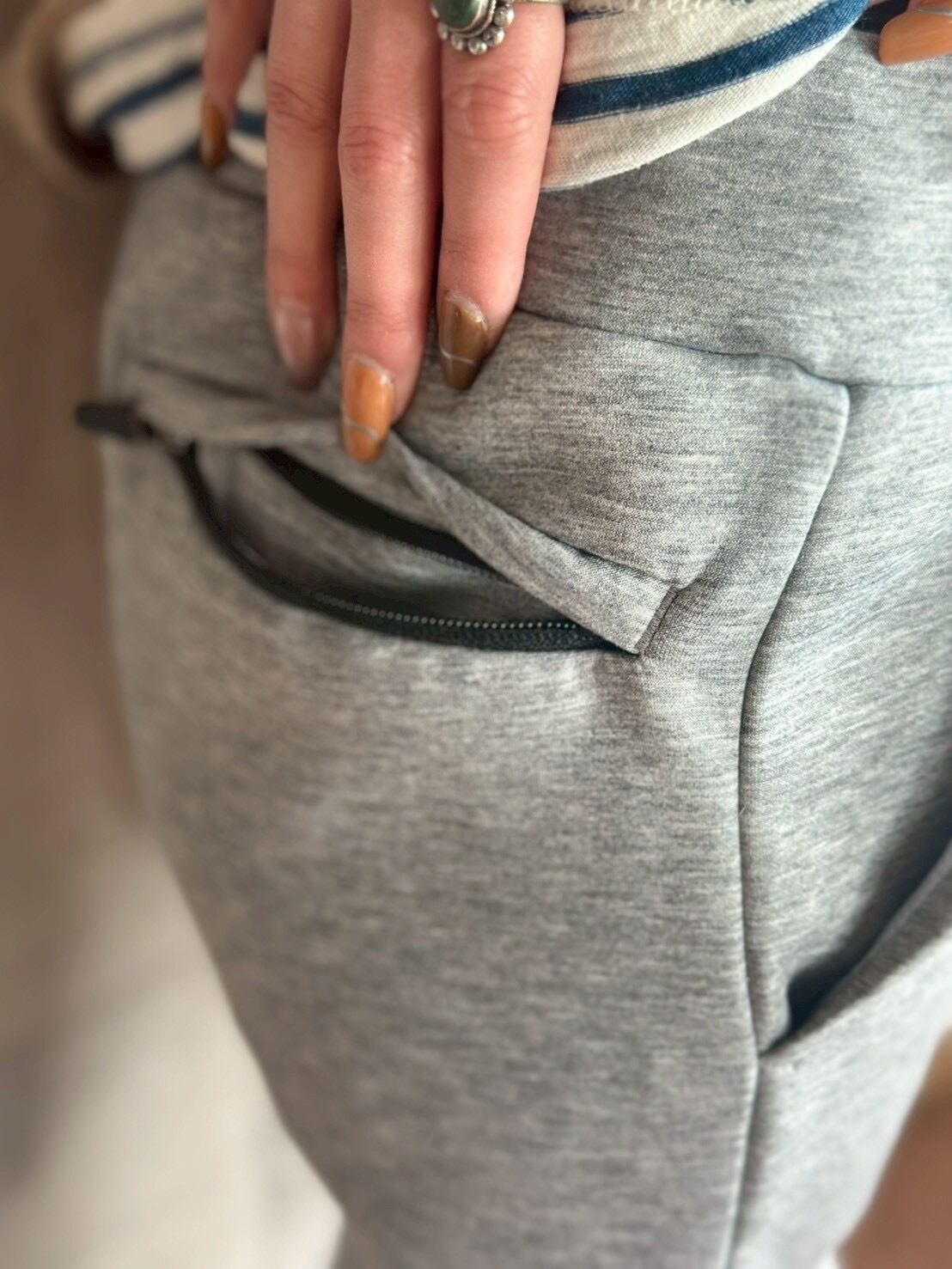 ヘザーグレー:ポリエステル 77%、レーヨン 17%、ポリウレタン 6%
