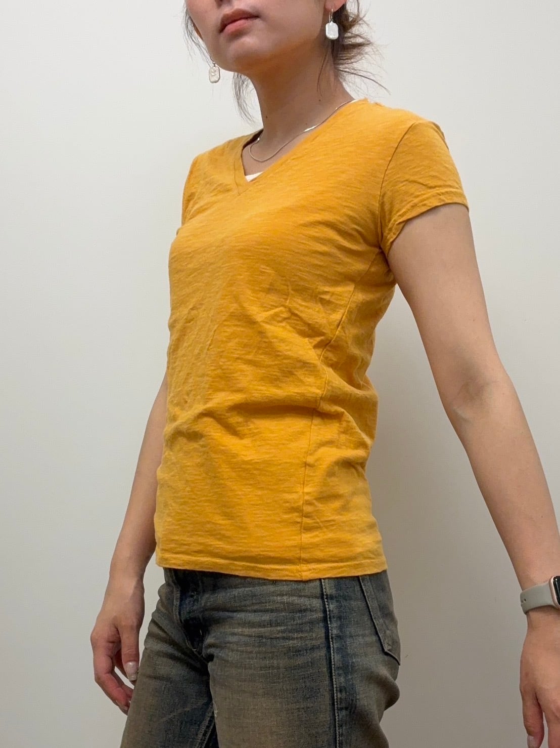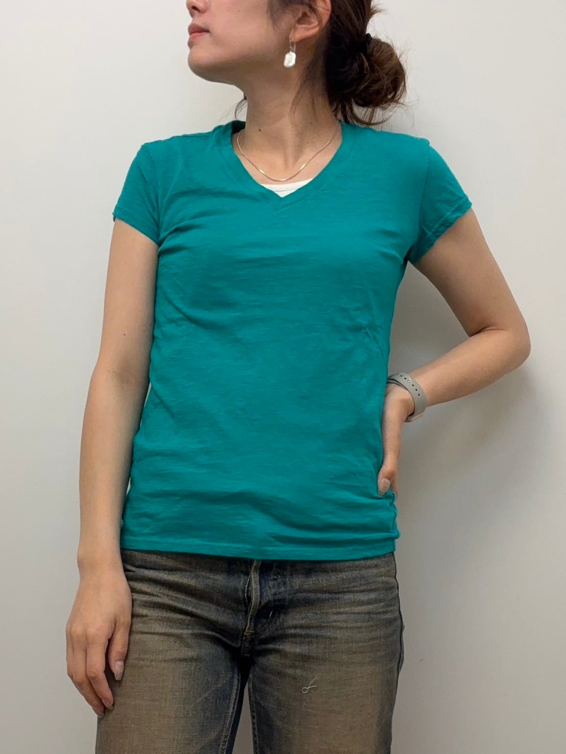VネックTシャツは、女性らしいデコルテラインが特徴の形。