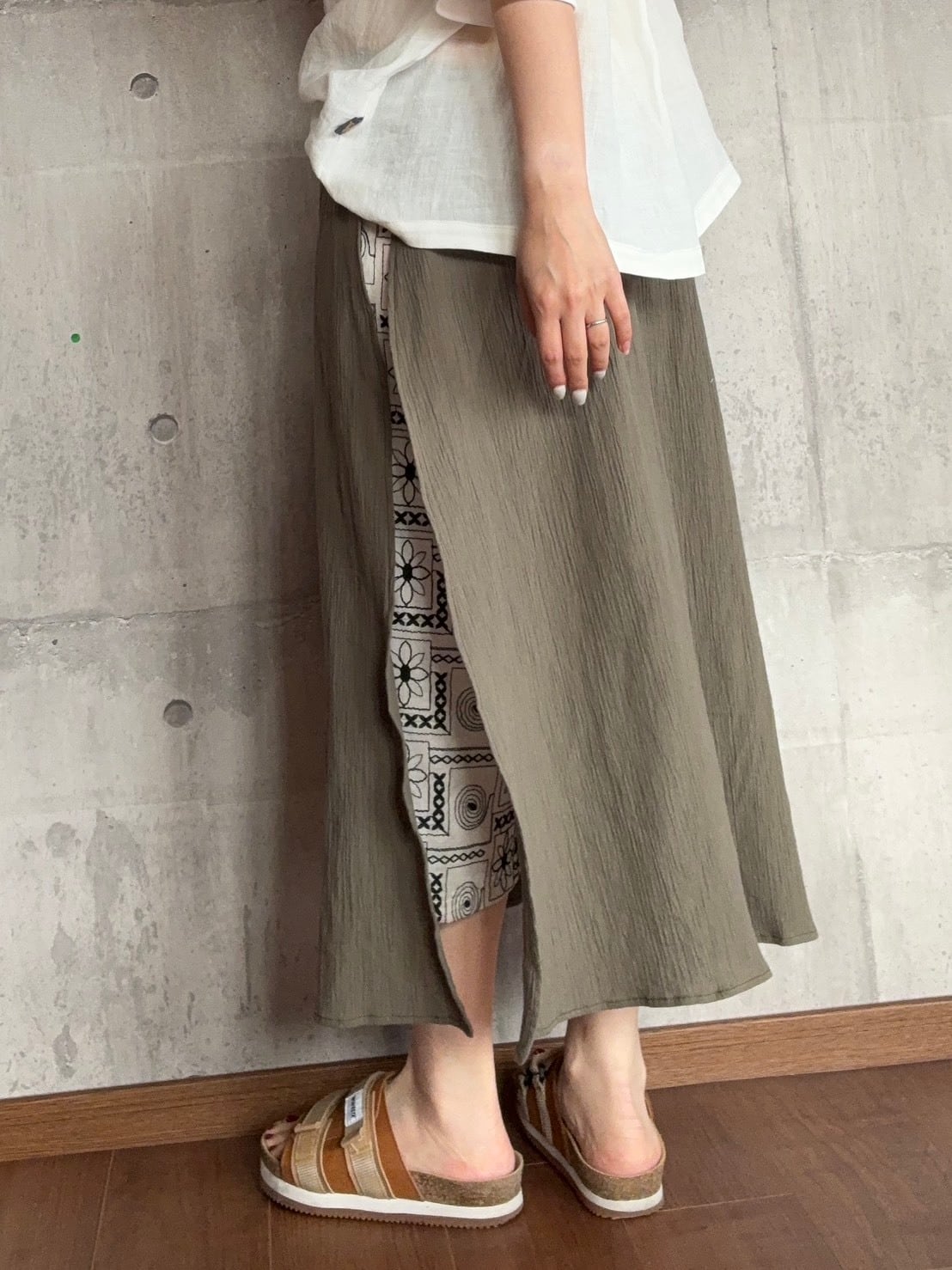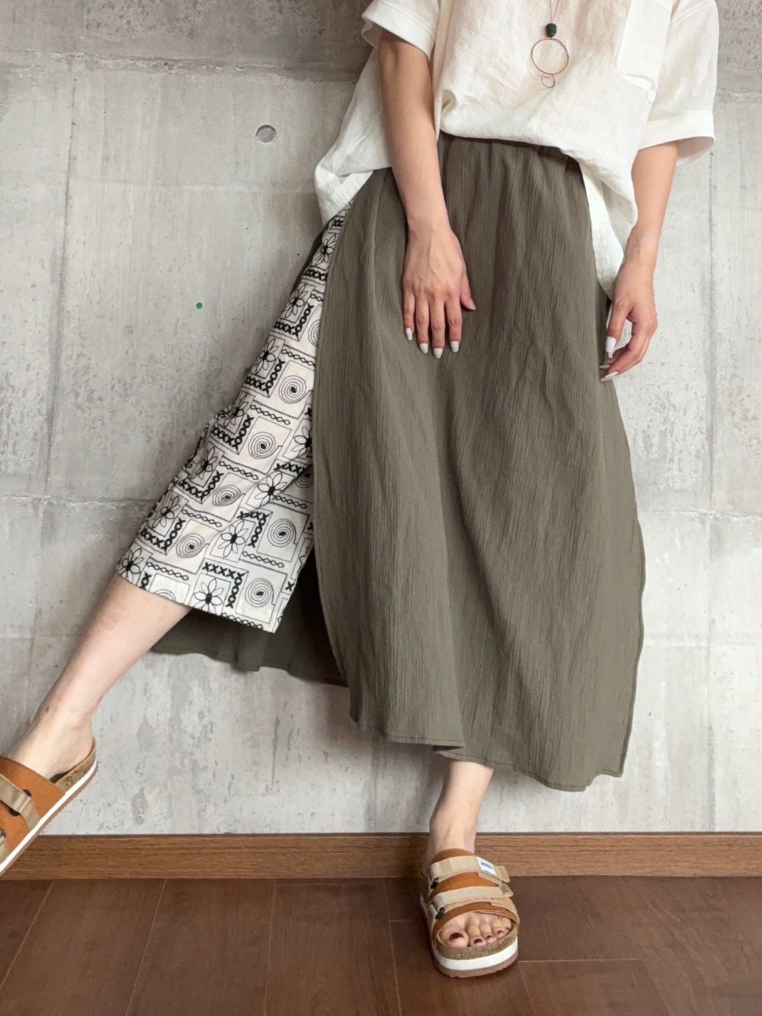 ウエストゴムで楽なパンツですが、フラップが付いておりスカートのような見た目になっています。