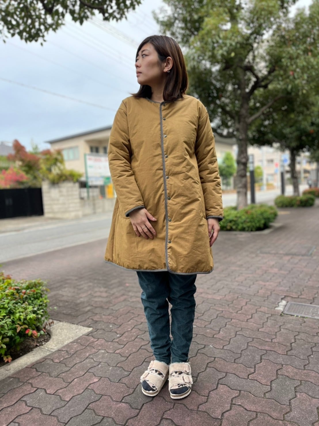 Aラインがシルエットをすっきり見せてくれて、ノーカラーなのでタートルネックやマフラーも合わせやすいデザインです。